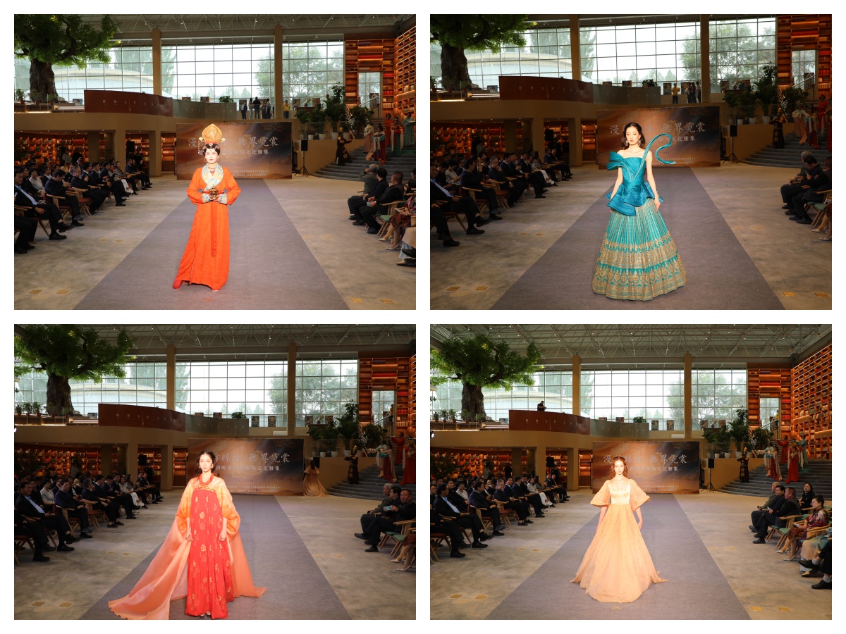 本次活动中的服饰作品由著名服装设计师、楚和听香品牌创始人、北京服装学院楚艳教授及其团队倾心打造,旨在让沉睡于壁画中的华服走出历史焕新而生。作品由敦煌壁画古代服饰和现代时装系列组成,将敦煌壁画艺术中传承千年的石青、石绿、朱红等传统色彩,以及九色鹿、宝相花等经典纹样,以符合当代审美的方式重新呈现,展示出丝路美学的绚烂与多元。